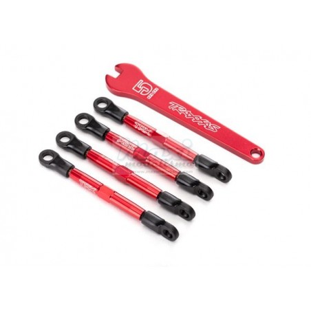 These are the strongest toe links you can buy for your 1/16 scale Traxxas model. Traxxas aluminum toe links are manufactured from high-grade 6061-T6 aluminum and anodized bright red, and the beefy size tells everyone your truck means business. The broad center nut makes it easy to line up the wrench for fast, trackside tuning. A handy machined groove on one end easily identifies the left hand threads. Lightweight aluminum turnbuckles are preassembled and ready to install.